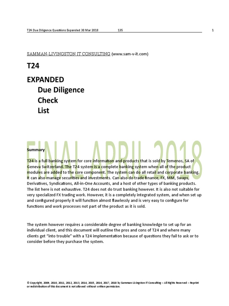 T24 290 Expanded Due Diligence Questions 30 Mar 2018 Ver 1 03 Databases Project Management